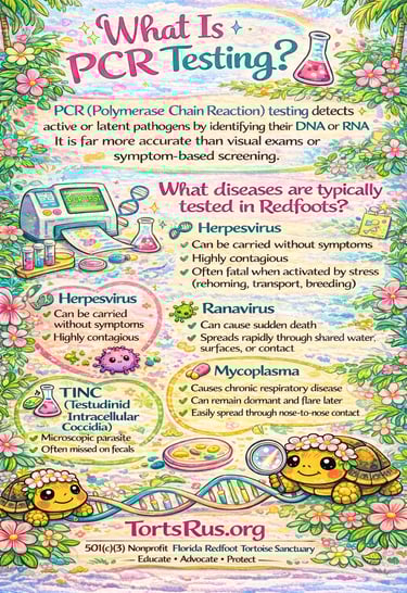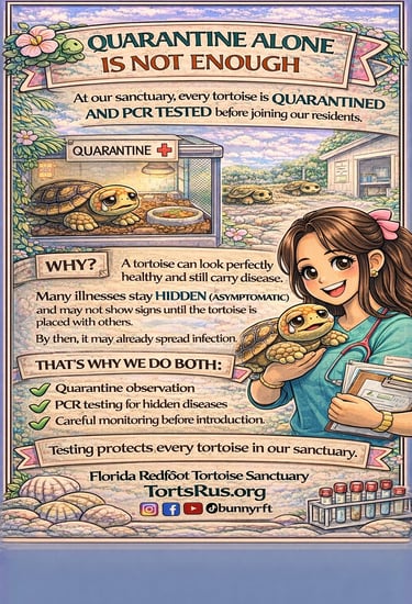 Your donation directly supports disease testing, quarantine care, and critical medical treatment for rescued Redfoot tortoises.